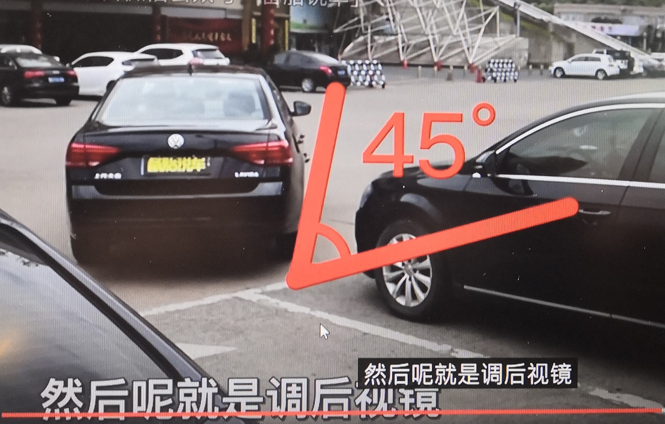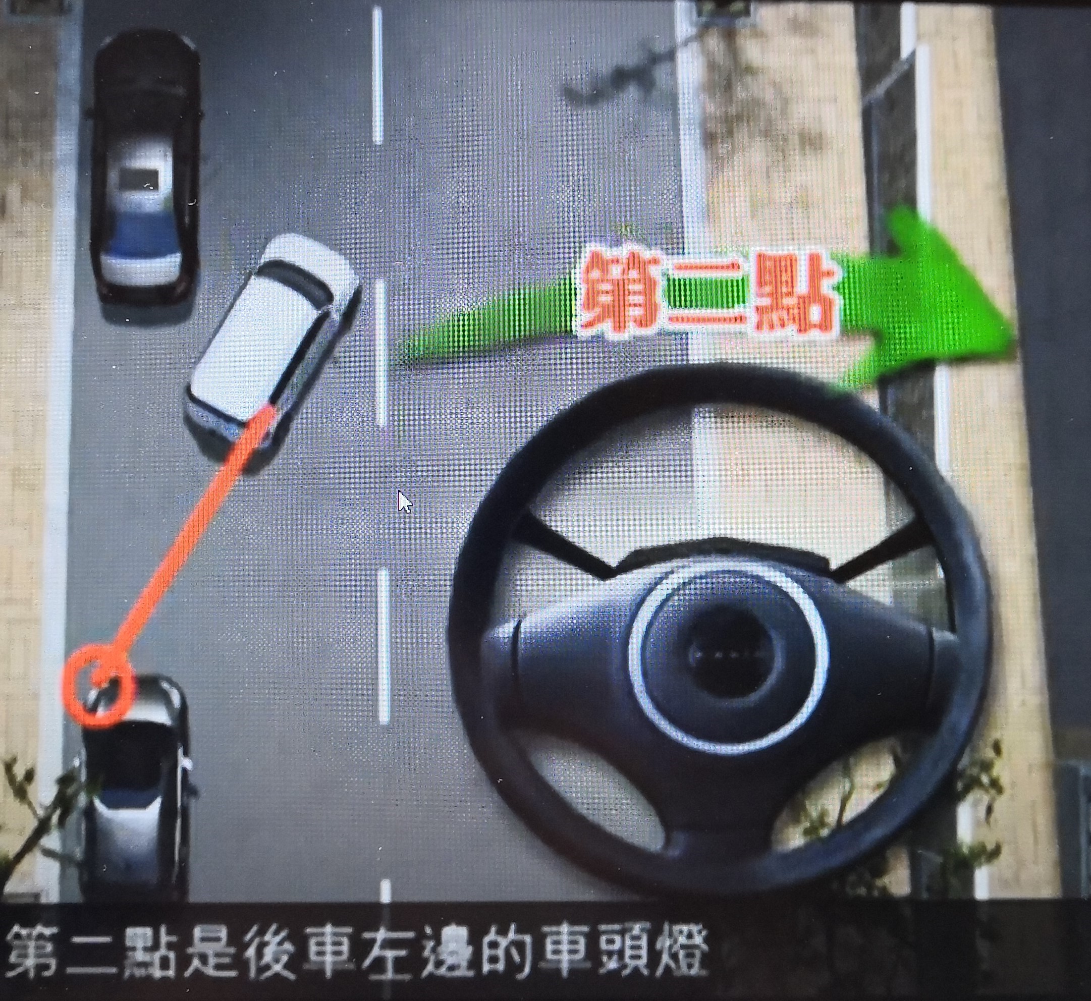 第二步: 繼續慢慢倒車,望着「右邊倒後鏡」,當見到後車的「車頭正中位置」時,便立刻「攞直軚」,然後「45度角繼續鈄線倒後駛入」車位。