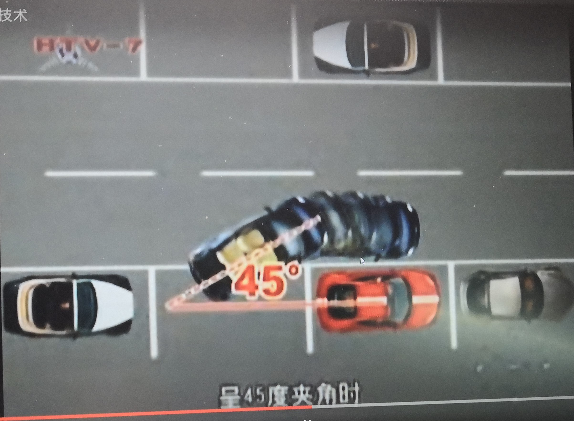 1. 泊位前與「鄰車橫距」保持越近越好。 向前駛至兩個車位停車。 在安全道路環境下,向外扭軑至45度角停下。