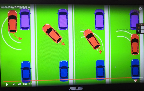 2. 然後入後波,大約退後至對上兩個車位中央(司機位計算)「扭軑駛入」。完成七,八成後留意左右兩邊側鏡作出修正,當車身與地界平衡回直完成ok。