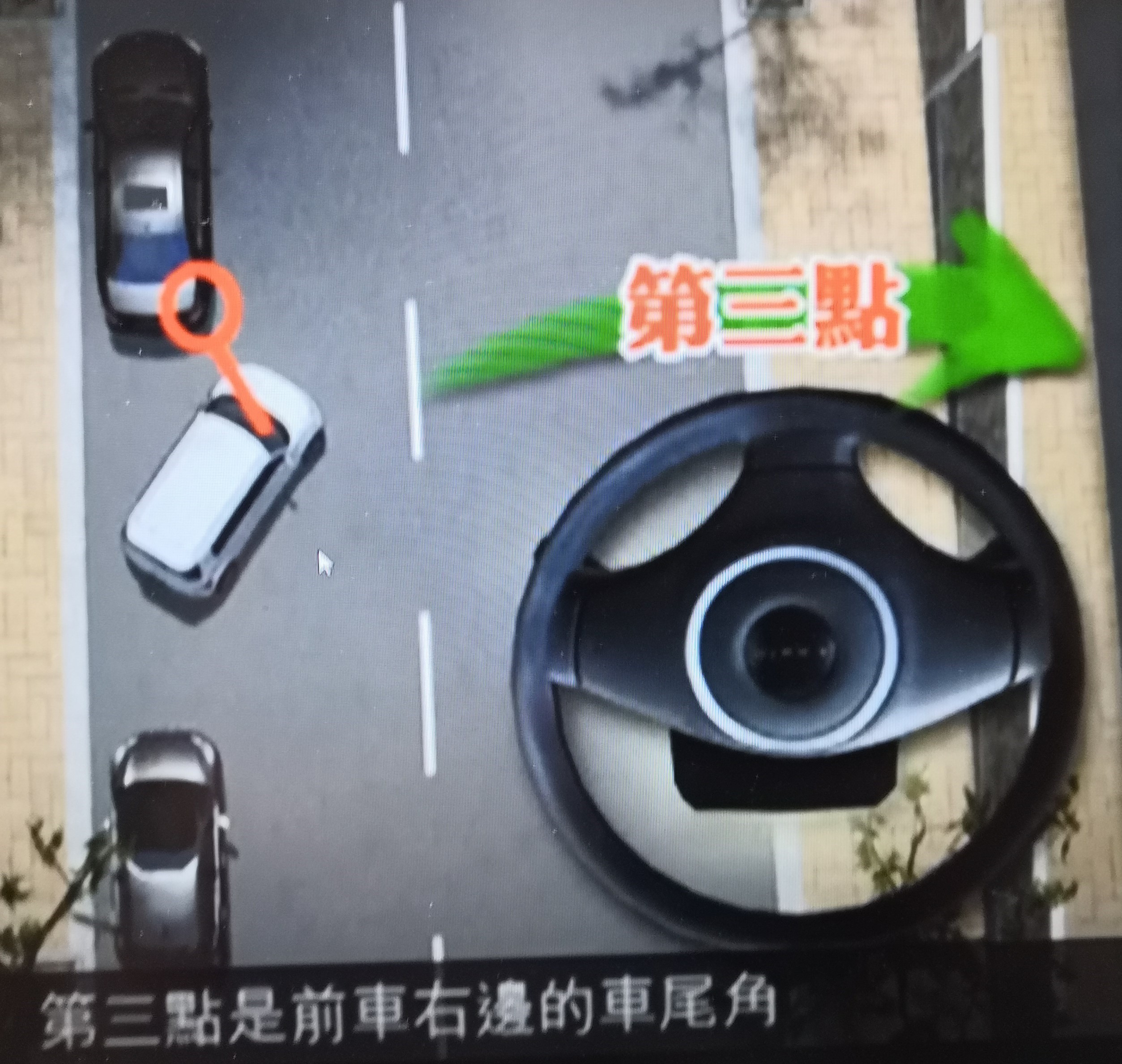 第三步:是決定車子停定後左右兩邊之位置是否正確。方法有:A. 直至右尾輪軑疊住車位白界線暫停。B. 從右側鏡望到後車剛剛越過「後車頭左尾角成一條平衡線」。 C. 倒後直至自己車左邊A柱旁的窗角與前車右尾角成一條平衡線(即擋風玻璃的左下角),確保安全。 便可立即「回盡右軚」倒後進入車位,直至車子與車位白界線平衡完成ok。