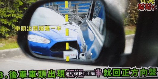 從右側鏡望到後車剛剛越過「後車頭左尾角成一條平衡線」回盡軑ok