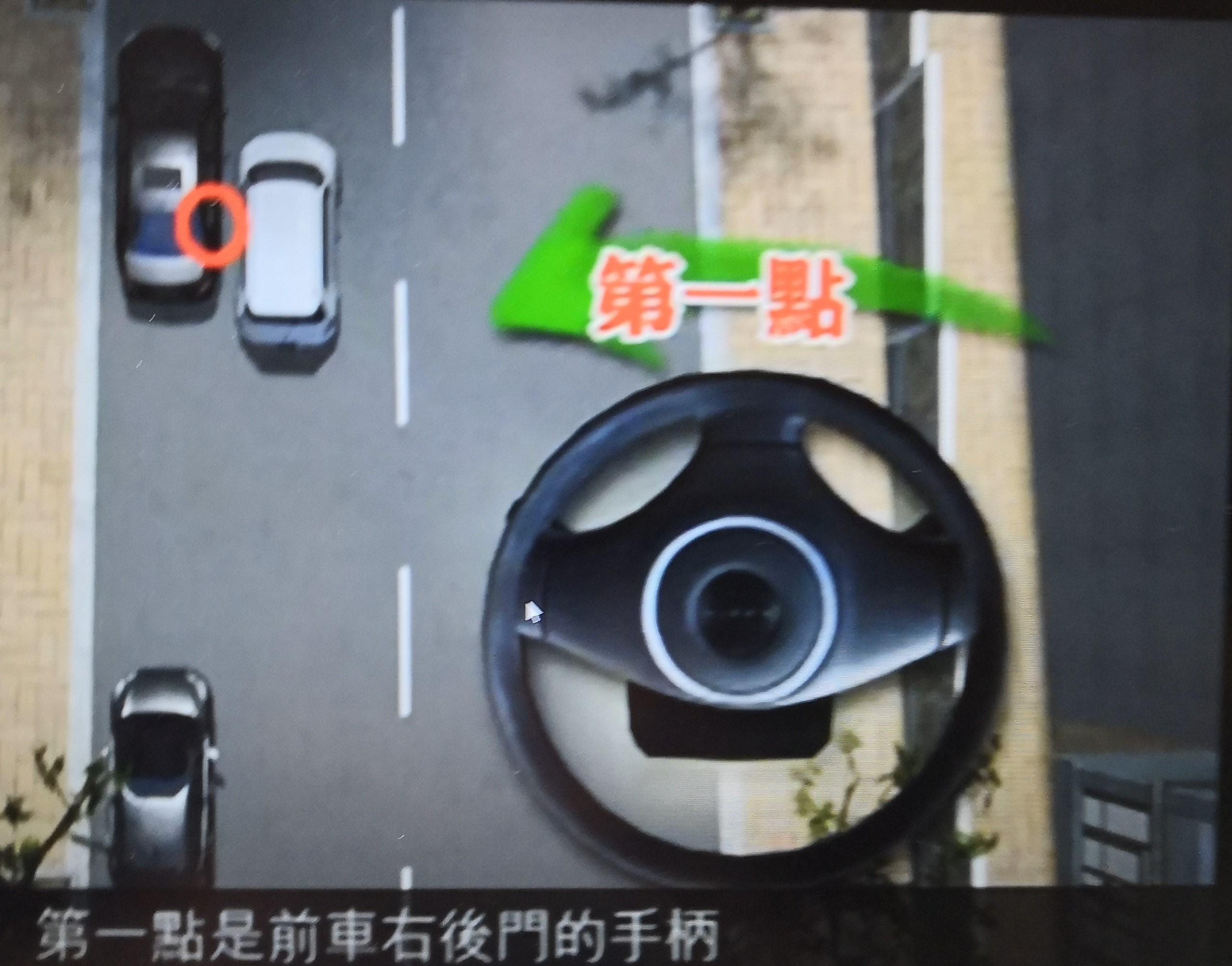 第一步:當準備泊左邊車位時,入後波,望住「左後窗的左下角」,或見到「前車右後門手柄位置」,即係(與鄰車尾平衡,並排位置)就可以開始「扭軚入」。