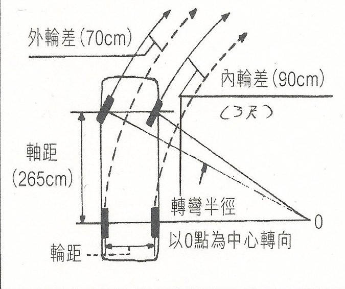 內輪差: 和汽車本身前後「輪距」長短有直接關係。 以一輛「的士」計算,內輪差為三尺,換言之一輛教練用的輕型貨車,在轉彎前尾轆與石壆之間的「橫距」,不能小於二尺半或,三尺,否則尾轆會觸及石壆。這是物理定律任何人都不能推翻。