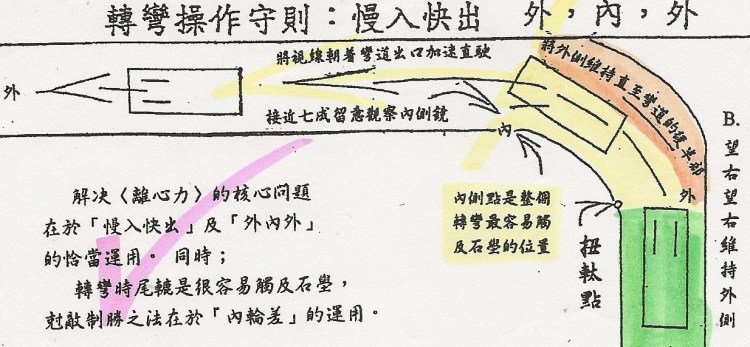 任何轉彎的邏緝或方法只有一個 「慢入快出」, 「外、內、外」與及「內輪差」的運用。 但係技巧變化實在數之不盡變幻無窮。轉彎與直路行駛之分別在於『離心力』。