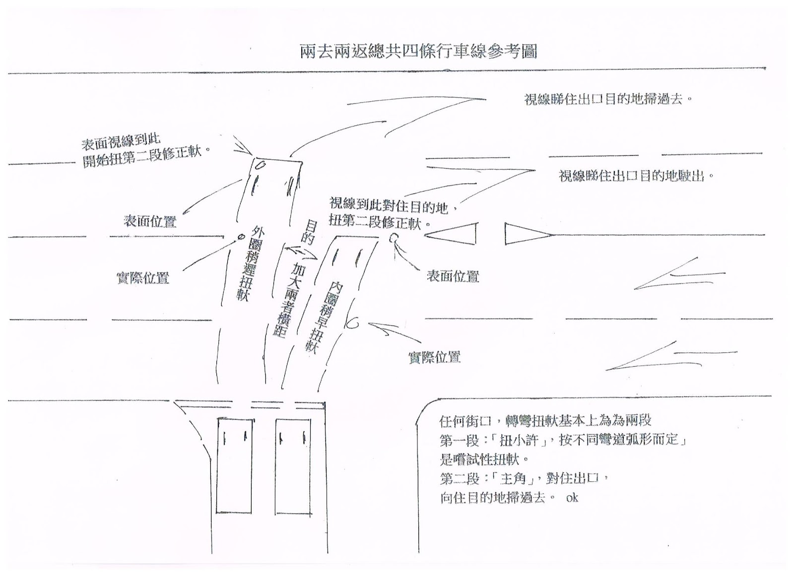 第一階段:保証「車速位置正確」,車速方面當然是慢駛,然後選擇開始扭軑地點,(記住要偷位,即貼近行車線外側)嘗試性扭小許軑而絕對不適宜過份扭軑,跟住彎道弧形然後「執好個修正點」位置以保証「車速位置正確」完成第一階段 ok, 。然後