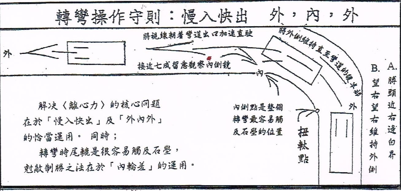 當轉彎扭軚過程中,大概完成彎角七成,需要觀察一吓《內側點》,如果發覺尾轆太接近石壆者,應該馬上作出小許〈反覆修正〉,避免尾轆觸及石壆。