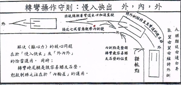 轉彎時的任何失控,追究佢的罪魁禍首就係《離心力》。 構成《離心力》的「主犯」就係入彎前未能將「車速」降低。 怎樣將《離心力》降低,而又不影响轉彎效率者,就是最好的轉彎方法。 轉彎秘笈中的〔慢入快出〕和〔外、內、外〕,就可以解決這個問題。
